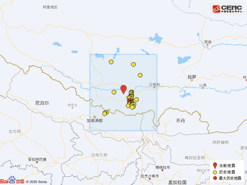 歷史地震:根據(jù)中國地震臺網(wǎng)速報目錄,震中周邊200公里內(nèi)近5年來發(fā)生3級以上地震共120次,最大地震是2025年1月7日在西藏日喀則市定日縣發(fā)生的6.8級地震(距離本次震中70公里),按震級大小前50次歷史地震分布如圖。